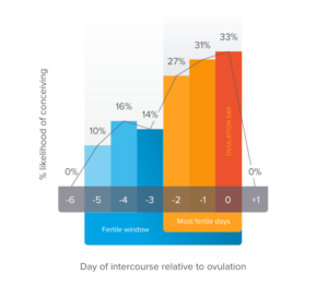 The three days leading up to and including ovulation are the most fertile. As the chart shows, if a woman has sex on any of these three days, she has a 27-33% chance of becoming pregnant.